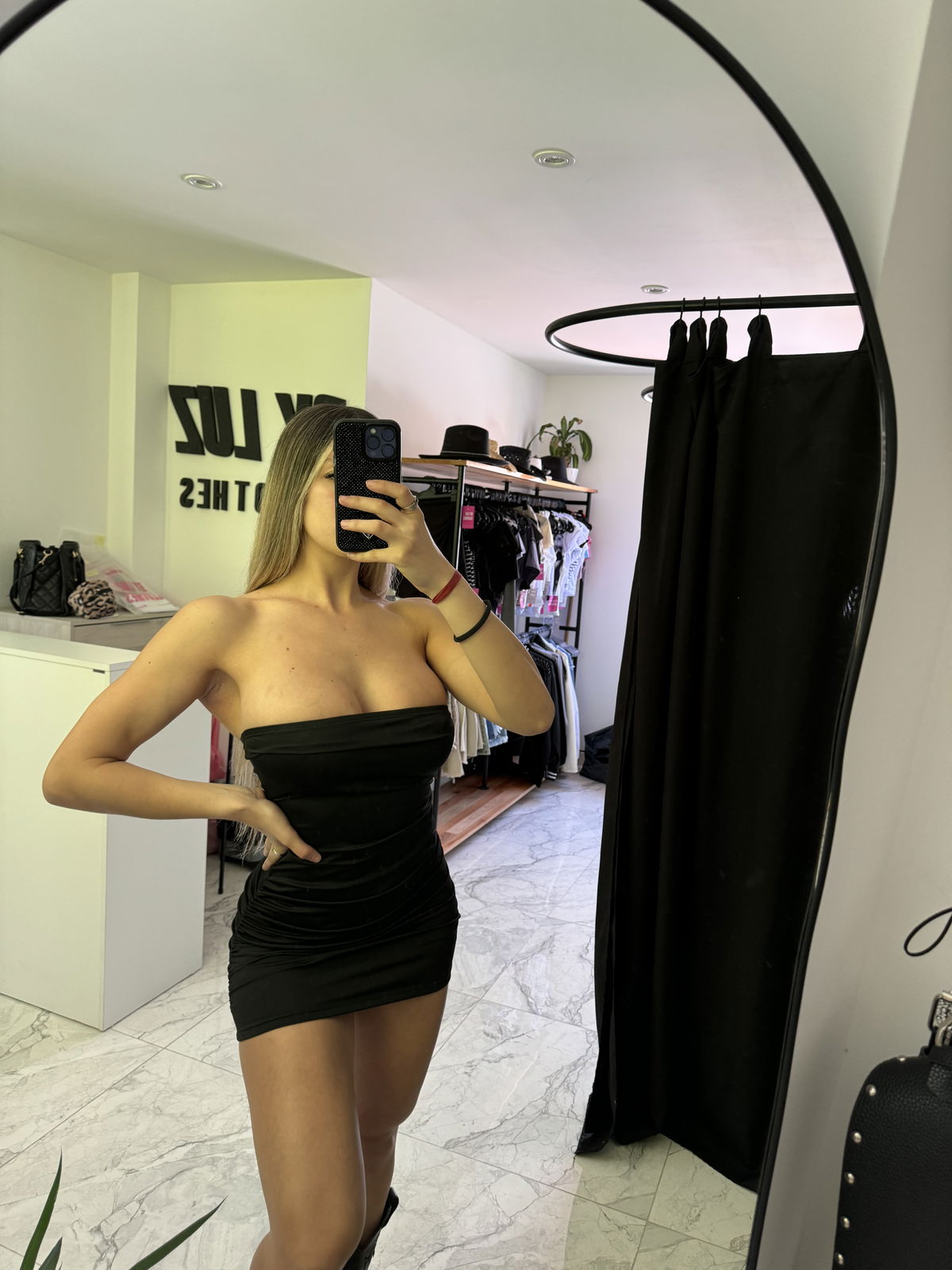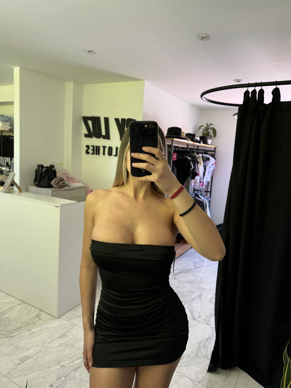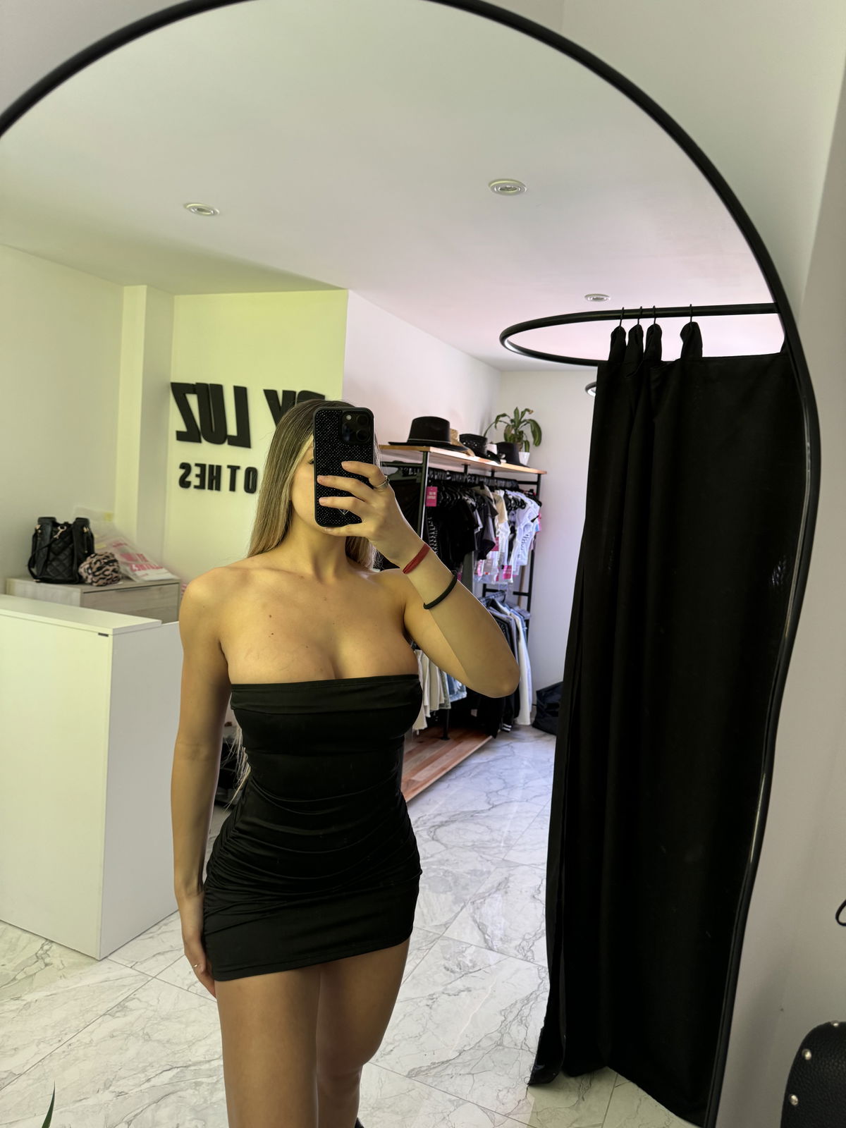 Vestido strapless lycra drapeado abajo